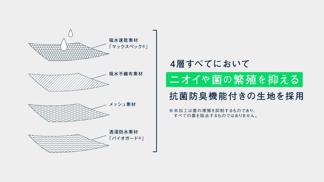 吸水部の4層すべてに施された抗菌防臭加工がニオイの元となる菌の増殖を抑えて快適さをキープします。さらに、肌に触れる部分は公的検査機関による洗濯耐久試験(SEKマーク基準)をクリアしており、繰り返し洗っても高い抗菌性能が持続するため、衛生面でも耐久性でも安心してお使いいただけます。