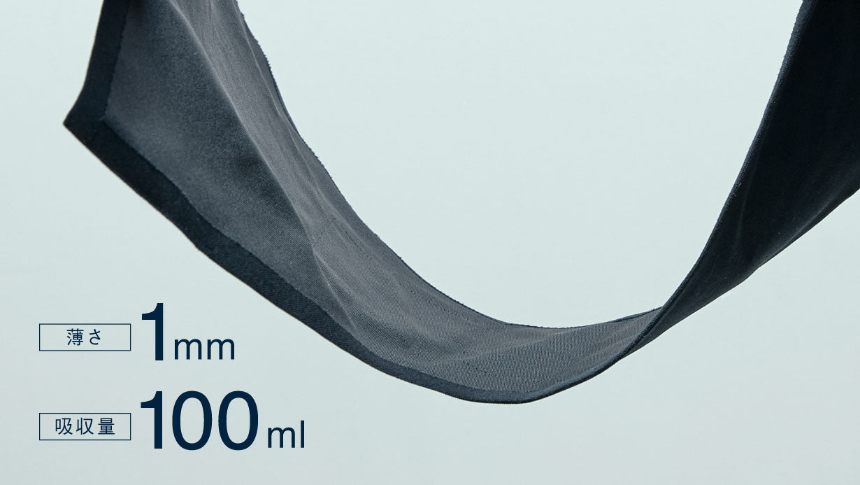 液体が吸水部分に落ちるとその場に留まらず分散する仕組みになっています。膨らむというよりは生地に広がりながら染み込むような感覚が近く、生地に触れた液体はすばやく拡散し表面が乾くため、サラサラとした肌あたりが持続します。